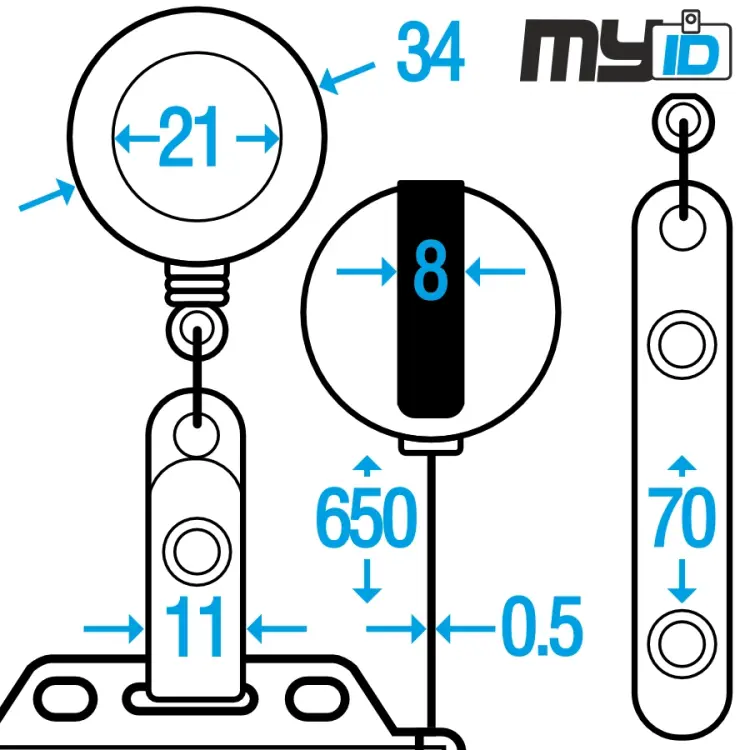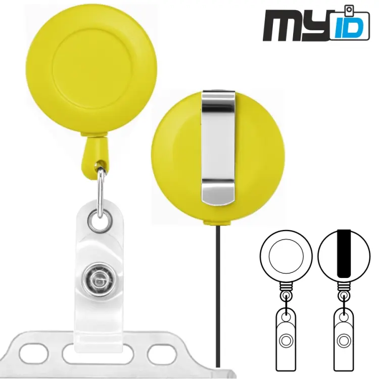 Praktický plastový matný naviják s klipem, ideální pro připevnění visačky, jmenovky nebo identifikační karty. Průměr 34 mm, délka lanka cca 65 cm.