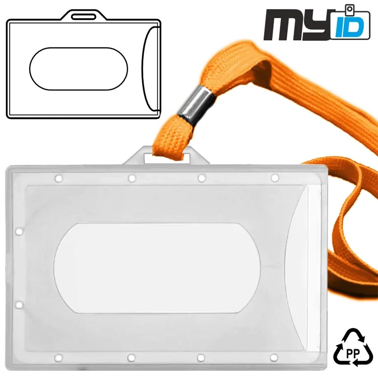 Tuhá plastová visačka pro kreditní karty rozměru 54×86 mm - provedení z průhledného polomatného polypropylenu a šňůrkou na krk. Uzavřená, jedna strana s oválným otvorem pro snadné vsunutí karty.